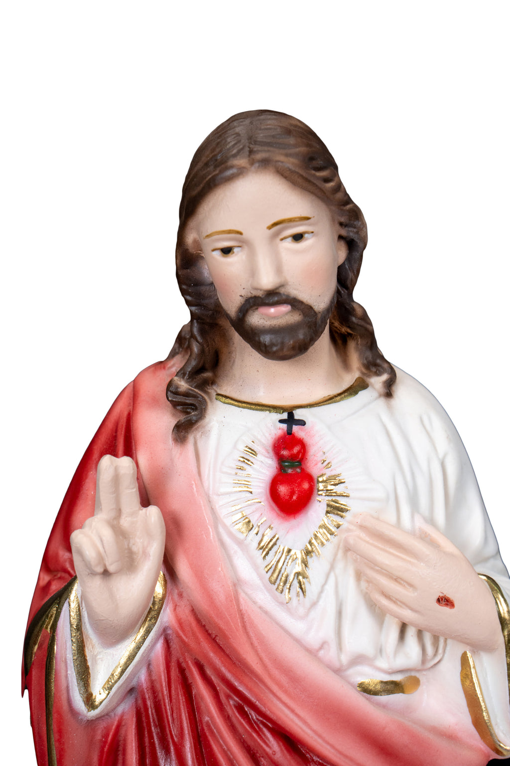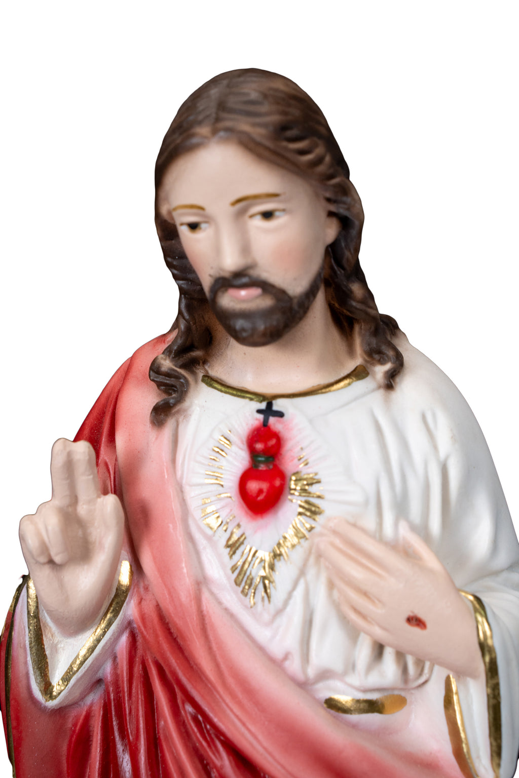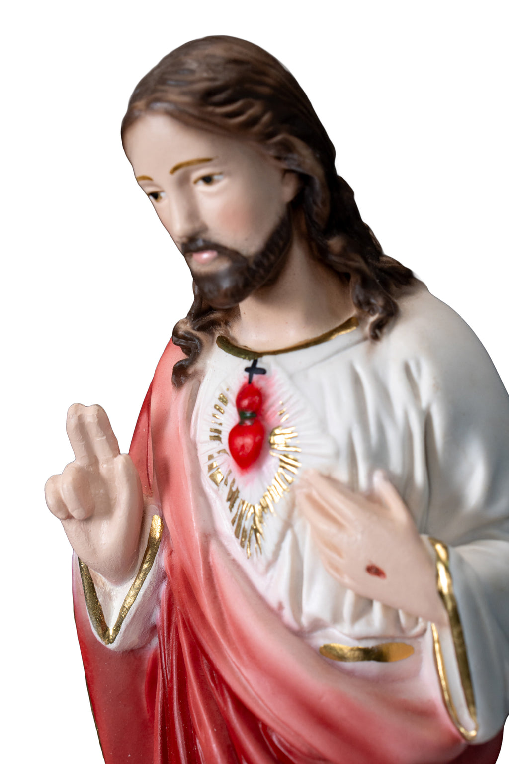 Beautiful statue of the Sacred Heart of Jesus with a Blessing Right hand. / Sagrado Corazon de Jesus bendiciendo con la mano derecha. Very popular devotion to the sacred heart of Jesus all over the world. What makes this statue different it's that the right hand is raised on a blessing position instead of pointing at his heart as the usual statues. We have the statue produce by our partner shop in Lucca,Italy. It's made in a traditional resin mold and made with white marble powder. Then cleaned and finished carving by the local artist. Next it's painted on the shop by the ladies that have been working there for many years. This image will make a beautiful gift to any family and home. We are very proud to be able to bring this quality at such a reasonable price. We will include a prayer booklet and a small rosary for you as our gift to this beautiful devotion. Blessings to all the families.