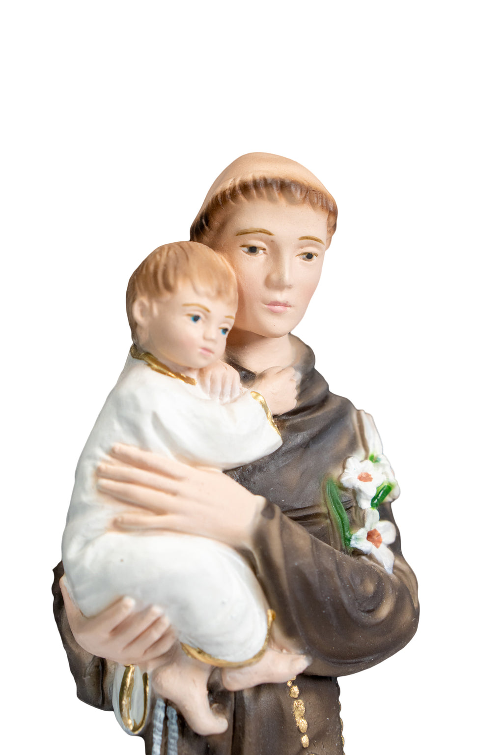 These are our statue of Saint Anthony of Padua. Doctor of the Church, and mostly known as patron to lost items, lost souls and great preacher. Feast day of June 13. We have the statue produce by our partner shop in Lucca, Italy. It's made in a traditional resin mold with white marble powder, then cleaned and finished by the local artist. Next it's painted on the shop by the ladies that have been working there for many years. This image will make a beautiful gift to any family and home. We are very proud to be able to bring this quality at such a reasonable price.