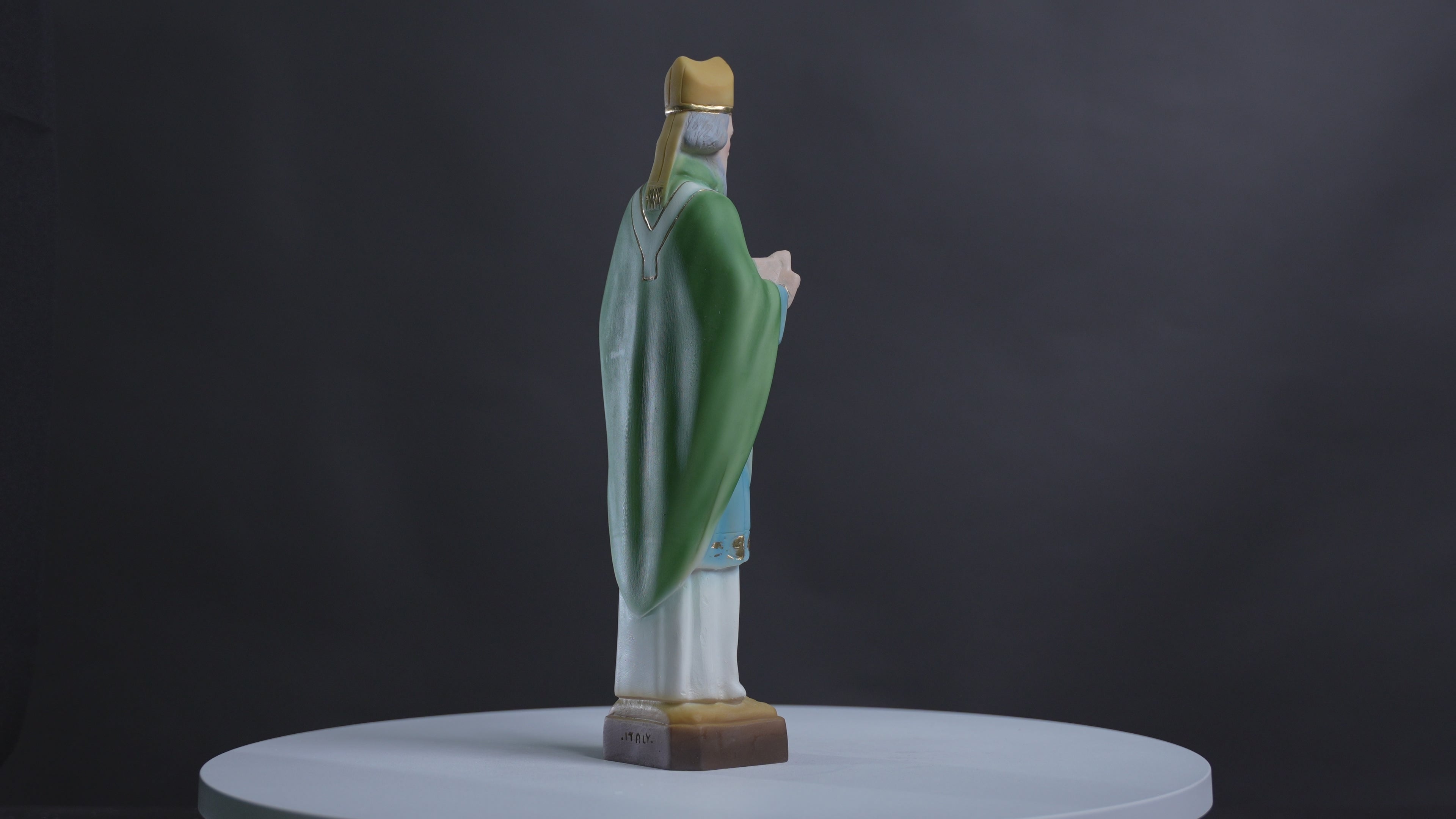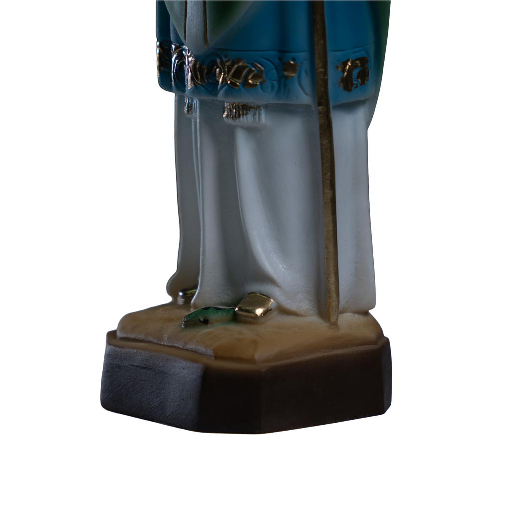 These are our statue of Saint Patrick famous Patron of Ireland. Feast day March 17. We have the statue produce by our partner shop in Lucca, Italy. It's made in a traditional resin mold with white marble powder, then cleaned and finished by the local artist. Next it's painted on the shop by the ladies that have been working there for many years. This image will make a beautiful gift to any family and home. We are very proud to be able to bring this quality at such a reasonable price.