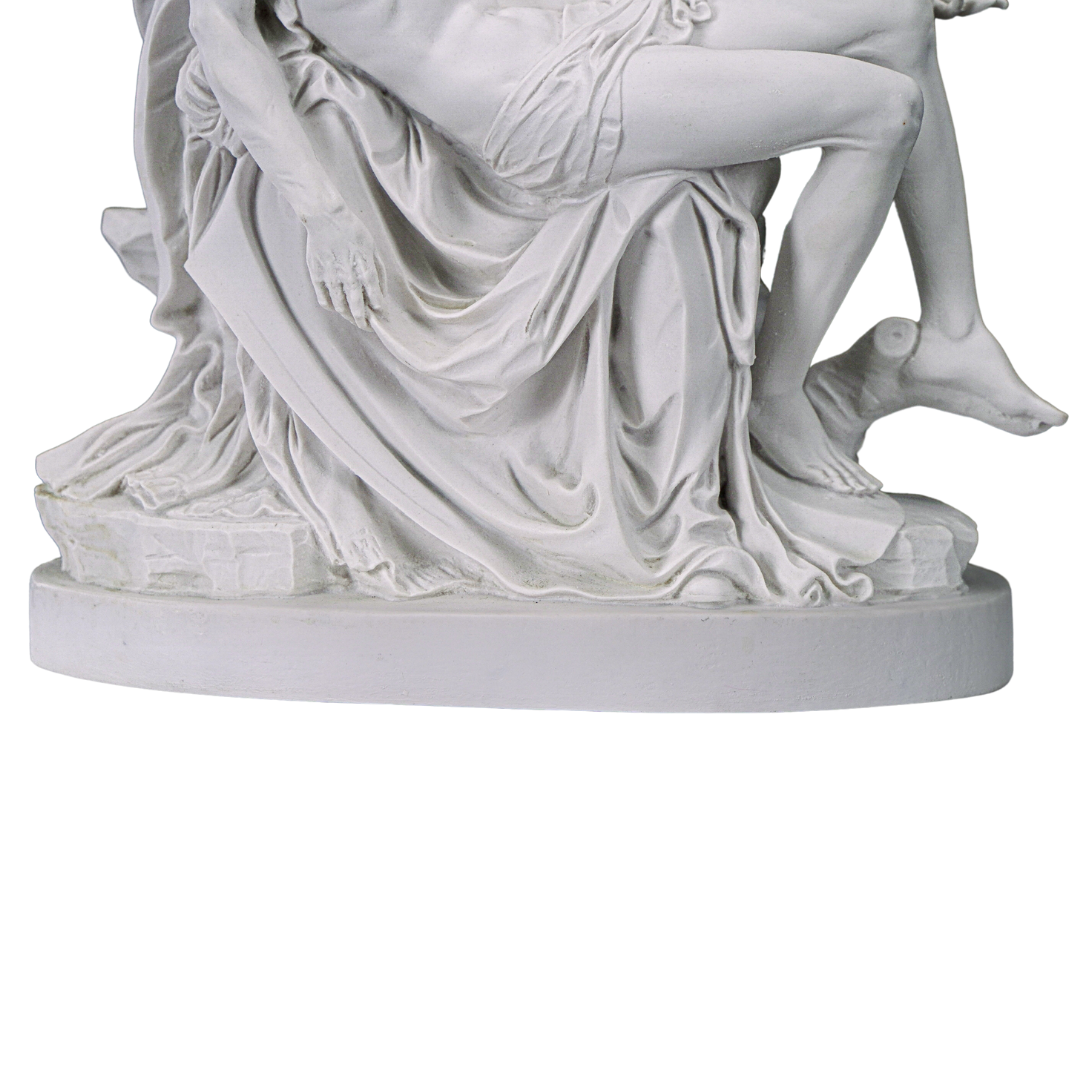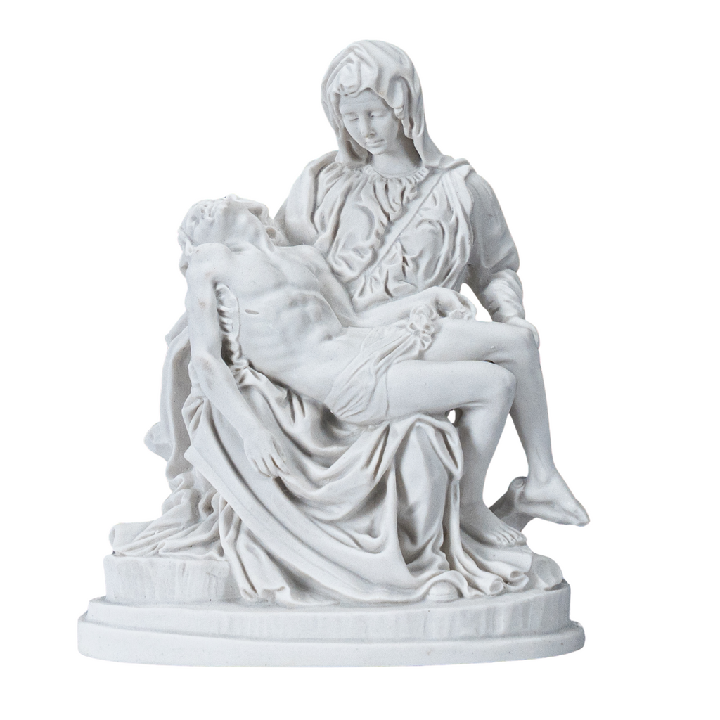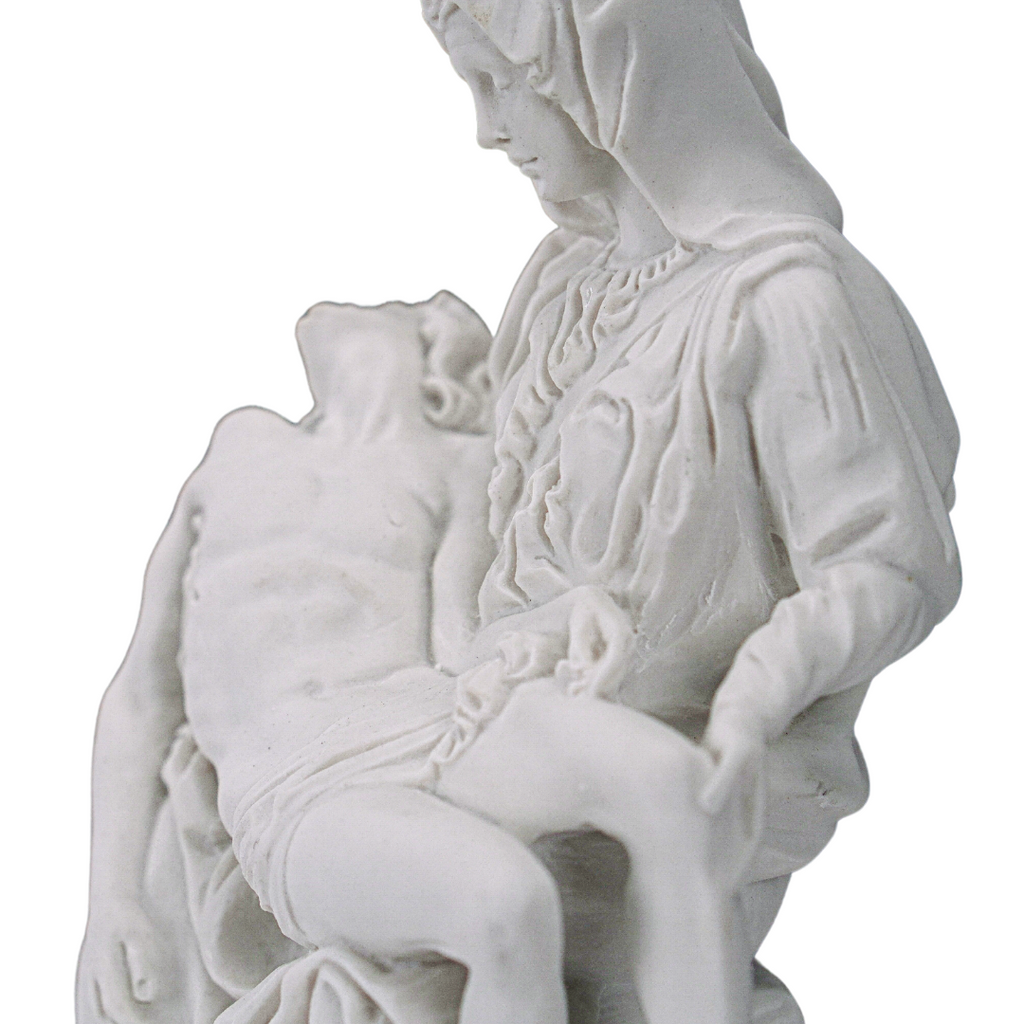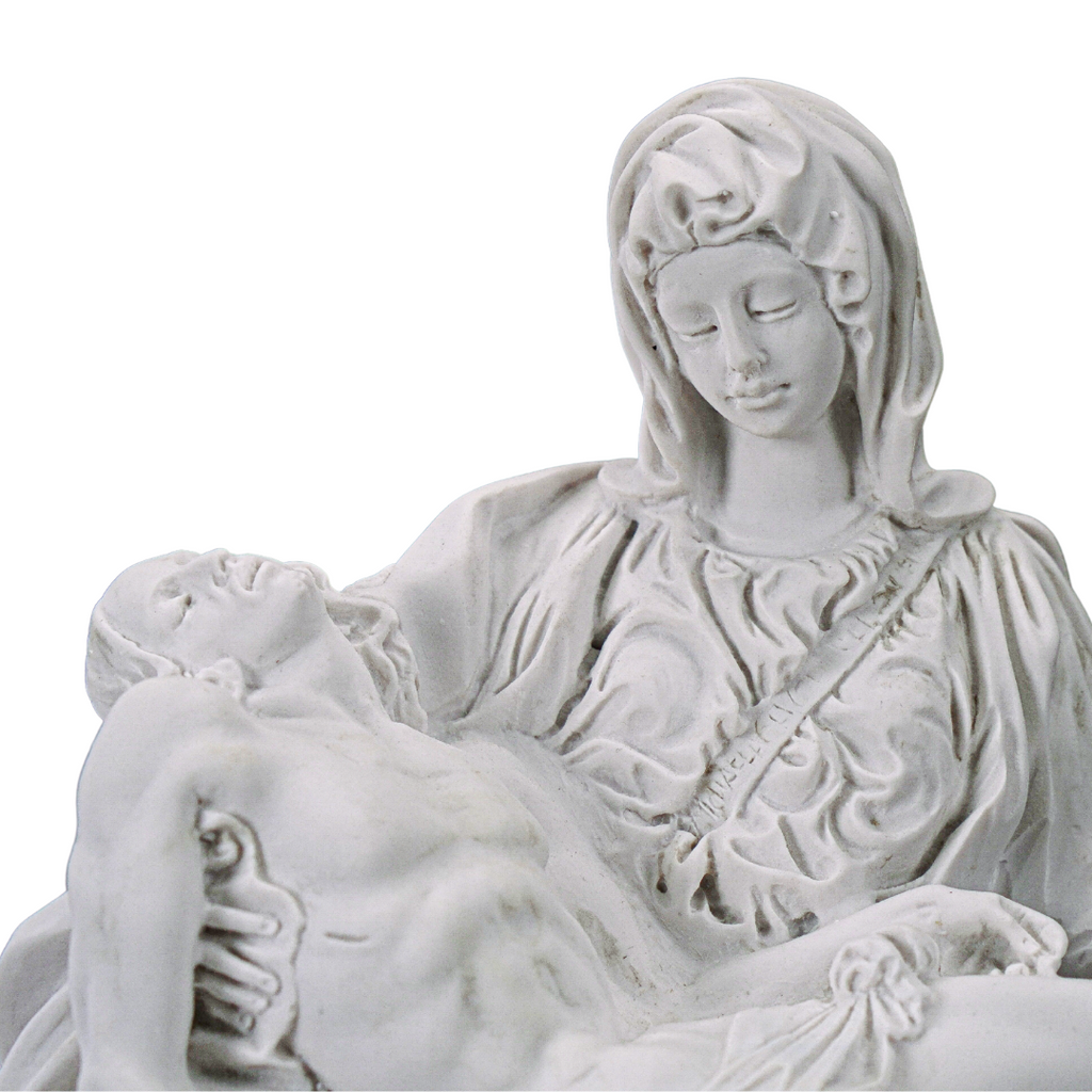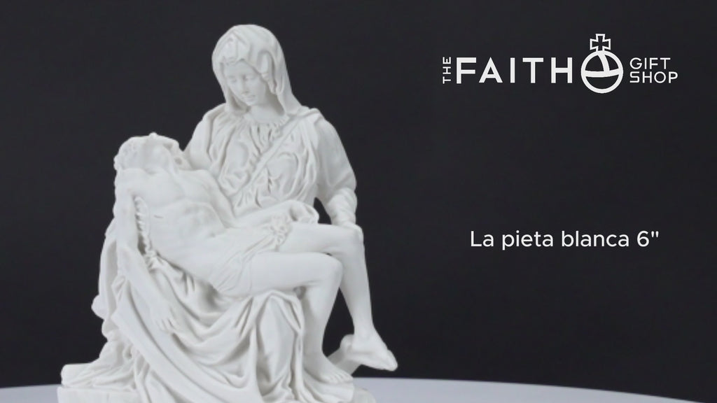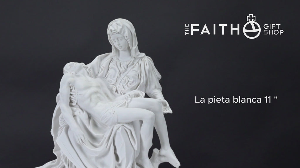 This is our statue of La Pieta in All White. Very beautiful and detail. We have the statue produce by our partner shop in Lucca, Italy. It's made in a traditional resin mold with white marble powder, then cleaned and finished by the local artist. This image will make a beautiful gift to any family and home. We are very proud to be able to bring this quality at such a reasonable price. We will include a prayer booklet and a small rosary for you as our gift to this beautiful devotion. Blessings to all the families. NOTE: There are small differences on the statue between the 6", 11", 14.6, 21.7" look at the pictures of each one to select the one you like the most.