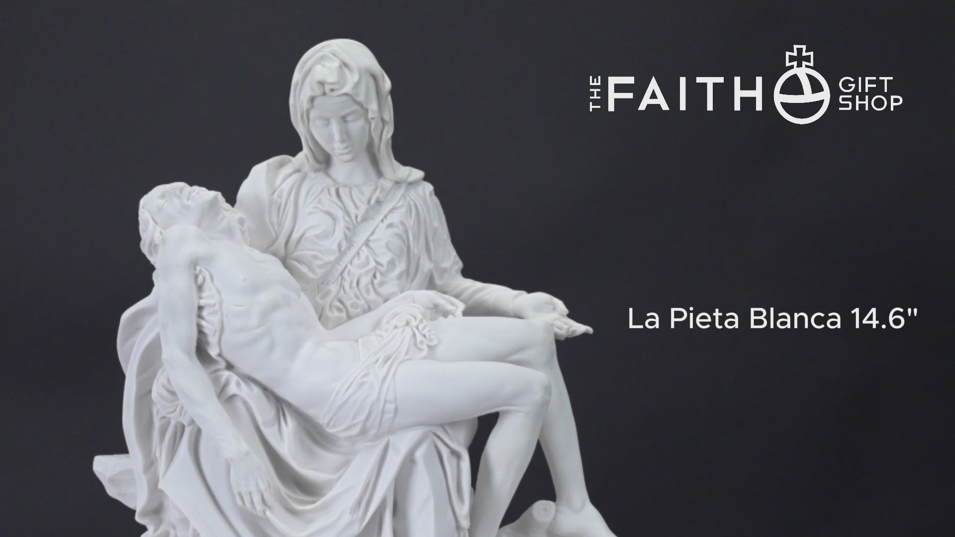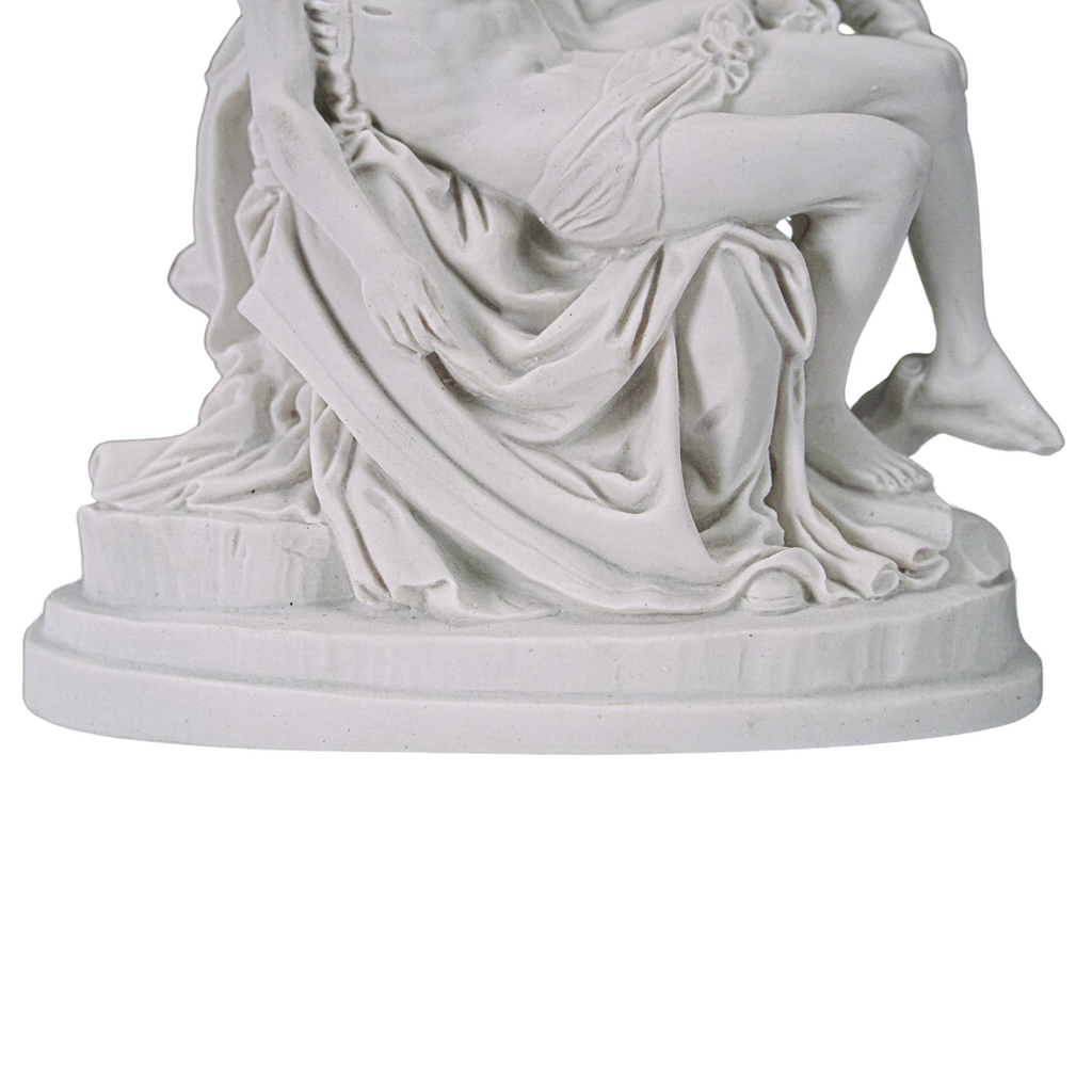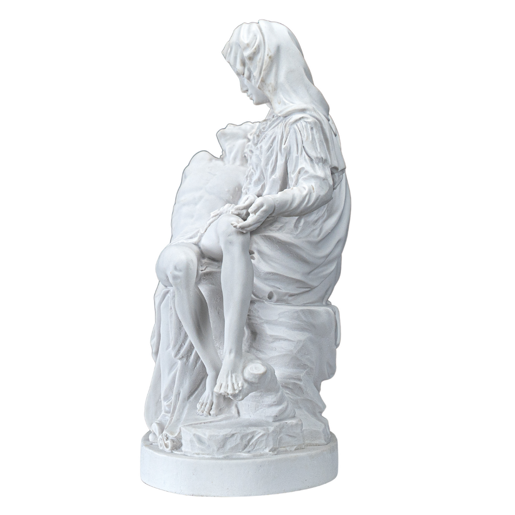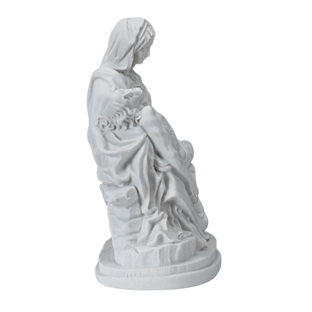 This is our statue of La Pieta in All White. Very beautiful and detail. We have the statue produce by our partner shop in Lucca, Italy. It's made in a traditional resin mold with white marble powder, then cleaned and finished by the local artist. This image will make a beautiful gift to any family and home. We are very proud to be able to bring this quality at such a reasonable price. We will include a prayer booklet and a small rosary for you as our gift to this beautiful devotion. Blessings to all the families. NOTE: There are small differences on the statue between the 6", 11", 14.6, 21.7" look at the pictures of each one to select the one you like the most.