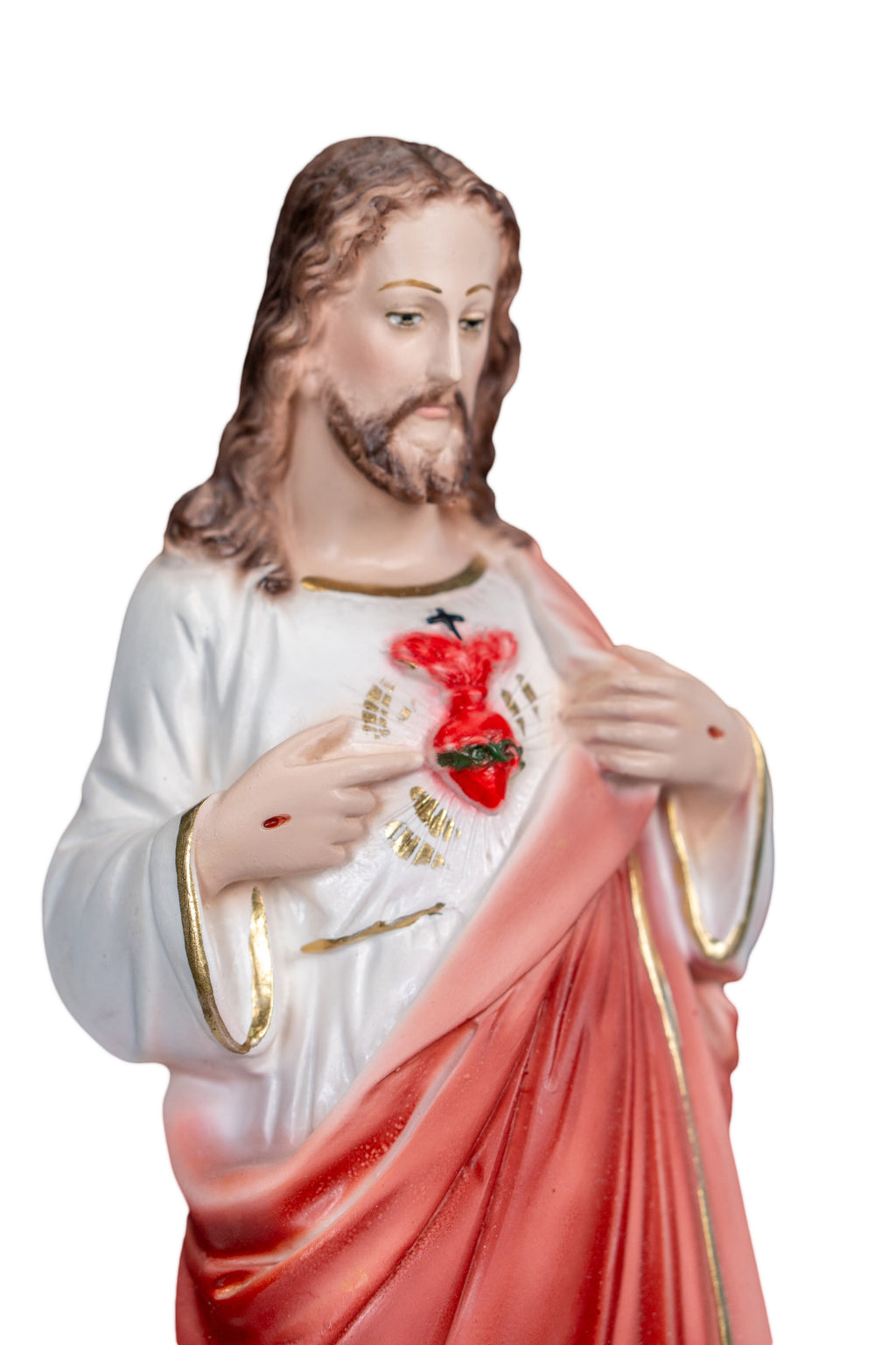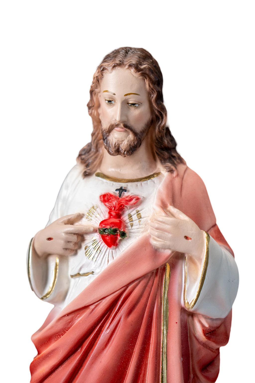 Beautiful statue of the Sacred Heart of Jesus. Sagrado Corazon de Jesus . Very popular devotion to the sacred heart of Mary and Jesus. We have the statue produce by our partner shop in Lucca, Italy. It's made in a traditional plaster mold, then cleaned and finished carving by the local artist. Next it's painted on the shop by the ladies that have been working there for many years. This image will make a beautiful gift to any family and home. We are very proud to be able to bring this quality at such a reasonable price. We will include a prayer booklet and a small rosary for you as our gift to this beautiful devotion. Blessings to all the families. NOTE: There are small differences on the statue between the 6", 9", 12" and the 16" , 20" look at the pictures of each one to select the one you like the most.