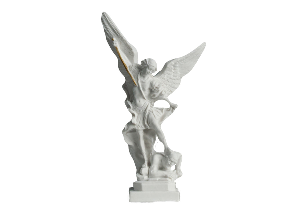 St Michael the Archangel. Very detail piece , from the angel wings, to his facial expressions and clothing. All White statue to look celestial. As the famous prayers goes " St Michael defend us on this day of battle...." We have the statue produce by our partner shop in Lucca,Italy. It's made in a traditional resin mold with white marble powder, then cleaned. and finally finished by the ladies that have been working there for many years. This image will make a beautiful gift to any family and home. We are very proud to be able to bring this quality at such a reasonable price. We will include a prayer booklet and a small rosary for you as our gift to this beautiful devotion. Blessings to all the families.