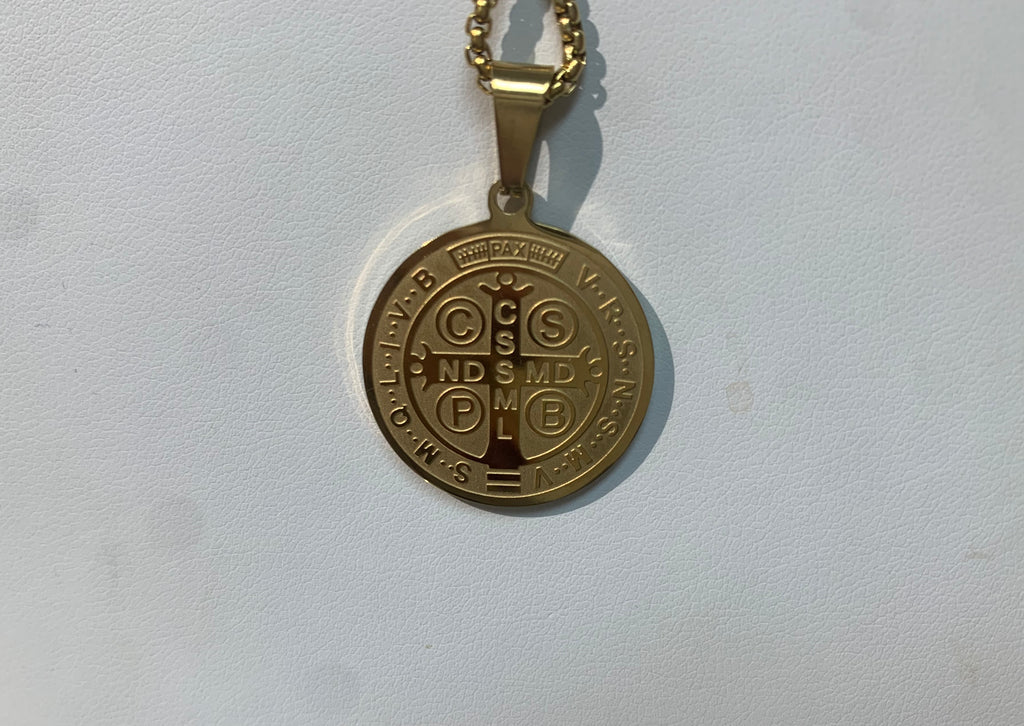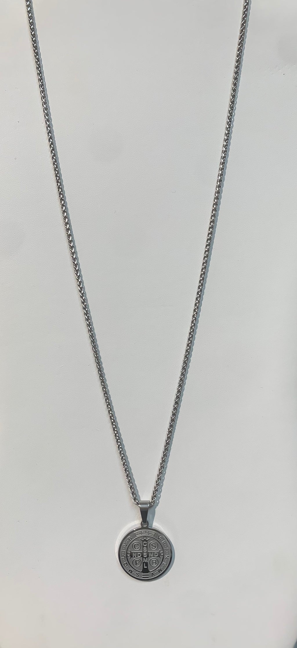 Stainless steel St Benedict medal pendant featuring the traditional cross design and protective inscription on a durable chain. This timeless religious pendant combines spiritual significance with practical durability, making it suitable for daily wear. The stainless steel construction resists tarnishing and corrosion, ensuring your medal maintains its appearance through years of use. Perfect for personal devotion or as a meaningful gift for those seeking spiritual protection and connection to Catholic tradition.